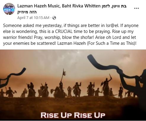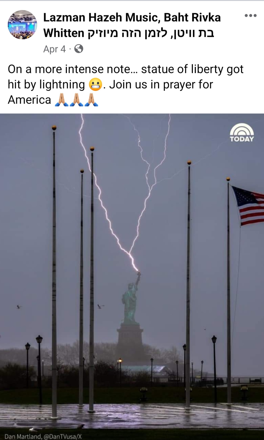 On Baht Rivka’s Lazman Hazeh Music website and Facebook page, she shared urgent posts of various events that recently took place in America and in Israel. These posts include the Statue of Liberty being struck by lightning, a post about the Francis Scott Key Bridge collapsing in Baltimore, the Eclipse, the Earthquake in the New York-New Jersey area, and a number of pictures and videos of the happenings of war in Israel. On April 7th, she the hinted words “Rise Up,” in reference to Israel.