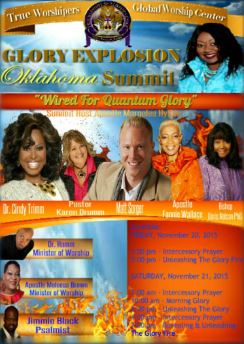 Glory Explosion guest speakers have included: Dr. Cindy Trimm, Dr. Tommy Tenney, Dr. Sam Hinn, Dr. Ana Mendez Ferrell, Dr. David Herzog, Dr. Lucy, Dr. Barbie Breathitt, Pastor Bob Sorge, Apostle Al Miller, John Eckhardt, Barbara Yoder, Rabbi Yisrael Ben Avraham, Bishop Joseph Garlington, Bob Sorge, Lamar Boschman and more. She has also included worship leaders such as Terry MacAlmon, Psalmist Jimmy Black, Tirshatha, David & Nicole Binion, and Melessa Ann Brown, just to name a few.
