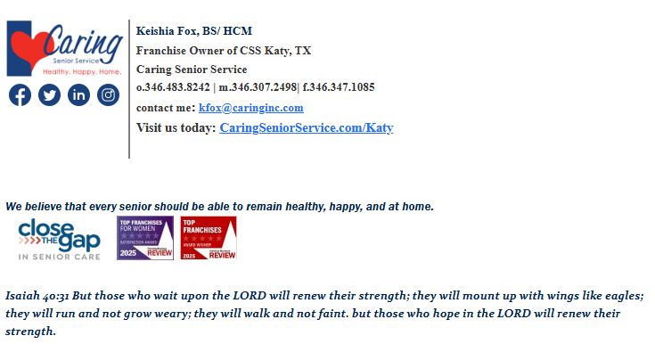 In January 2025, they officially opened Caring Senior Service of Katy. They service Katy, Texas and the surrounding areas with her caregivers, who are doing a phenomenal job. Their healthcare service is providing both spiritual and practical care to seniors and their families.